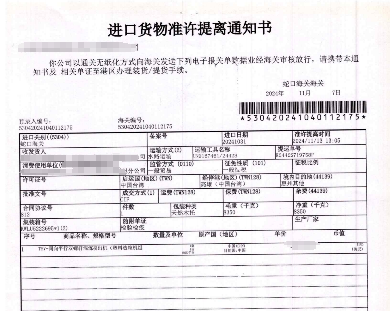 客户从台湾进口一套同向平行双螺杆混炼挤出机(塑料造粒机组)(旧)设备,咨询柏新国际供应链团队。